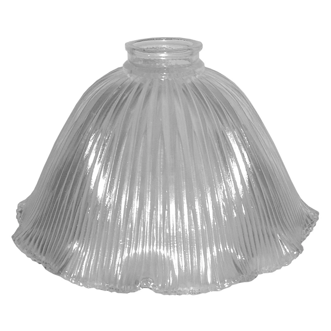 Prismatic glass light shade in a frilled shape. This clear ribbed glass lamp shade is also sometimes know as a Holophane shade. It has a 2″ rim that fits our 2″ lamp shade holder for a ceiling pendant light fitting.